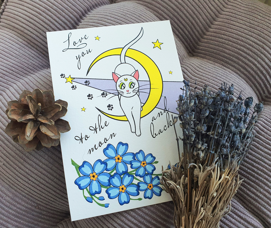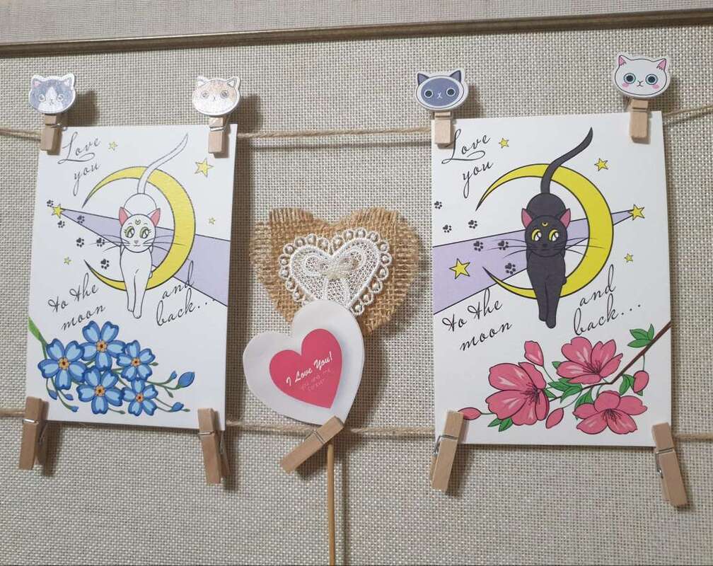 Опис: Благодійні листівки "Love you to the moon and back" двох видів: з чорною кішкою Luna та білим котом Artemis у виконанні Liudmyla Sha у стилі японського аніме серіалу "Sailor Moon". Неодмінно порадуйте близьких та друзів таким подарунком, який не лише підніме їм настрій, але й допоможе у дуже добрій і благородній справі!